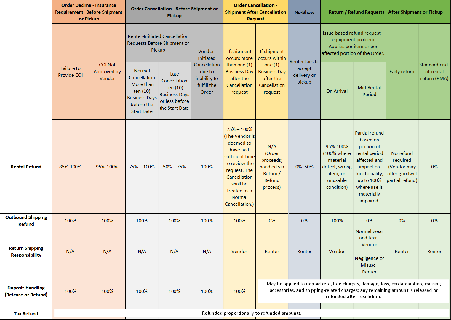 The table below summarizes common scenarios. Actual outcomes depend on timing, circumstances, and Vendor review, in accordance with the Terms of Service.